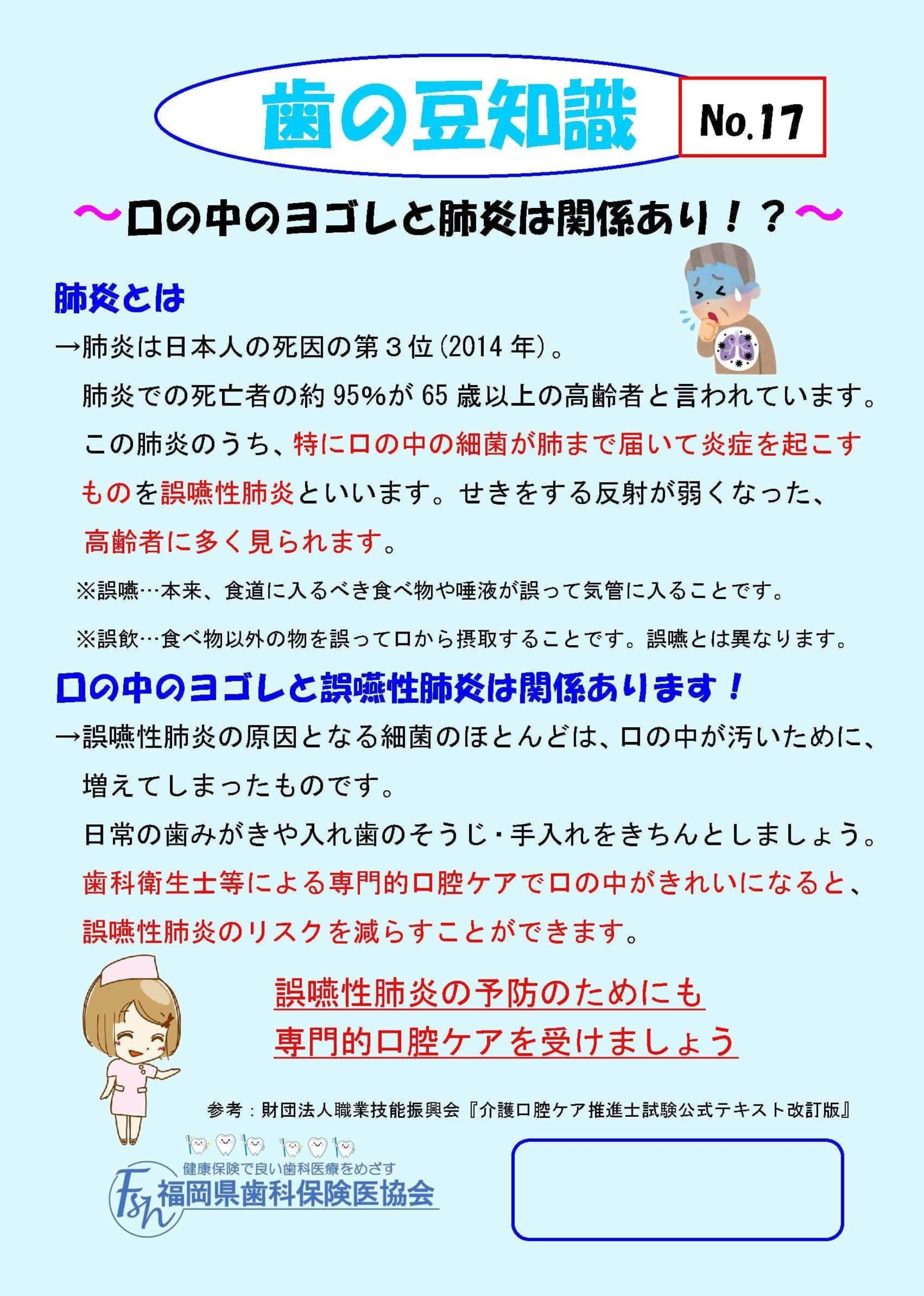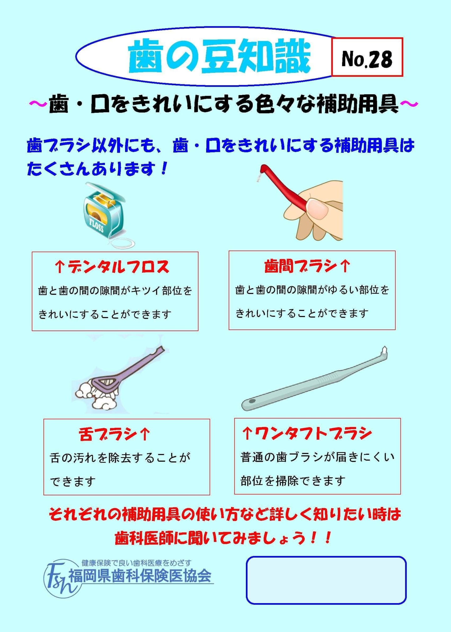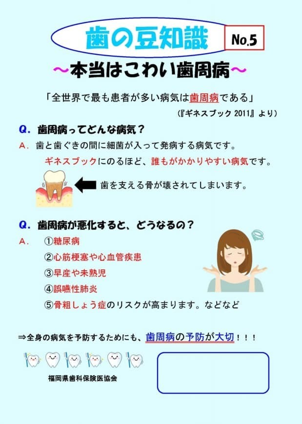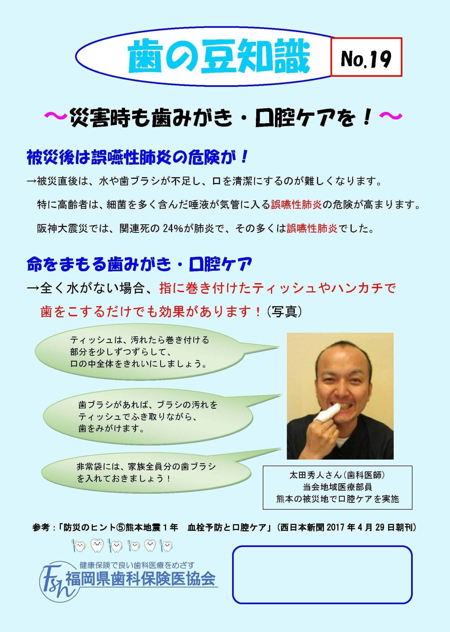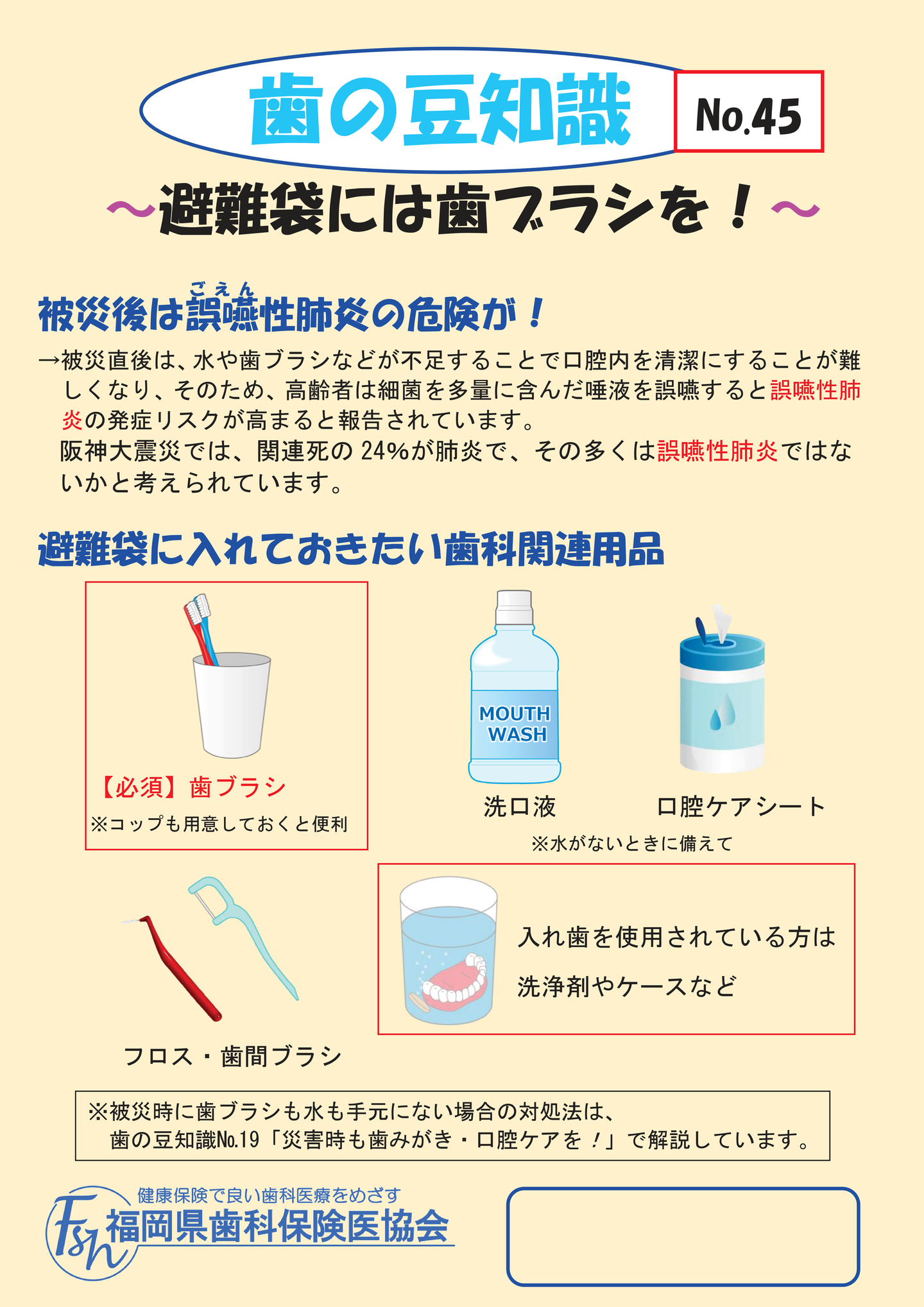 現在、当会の冊子『歯の豆知識』の災害関連ページ「災害時も歯みがき・口腔ケアを!」「避難袋には歯ブラシを!」を、被災地での啓発にご活用いただいています。