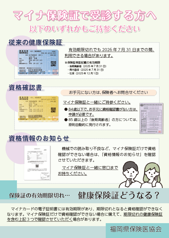福岡県内の全市町村の国民健康保険(国保)の健康保険証も2025年7月末で有効期限が切れます。 国保でも同様に資格確認書を希望する方からの申請が市町村に集中する恐れがあることから、当会は、住民の皆さんが安心して医療が受けられるよう、後期高齢者医療制度と同じく、2025年7月末までに資格確認書を全ての被保険者に、申請の有無に関わらず発行する必要があると考えています。