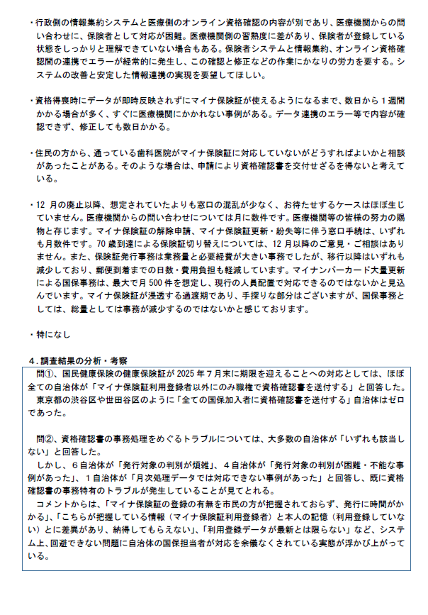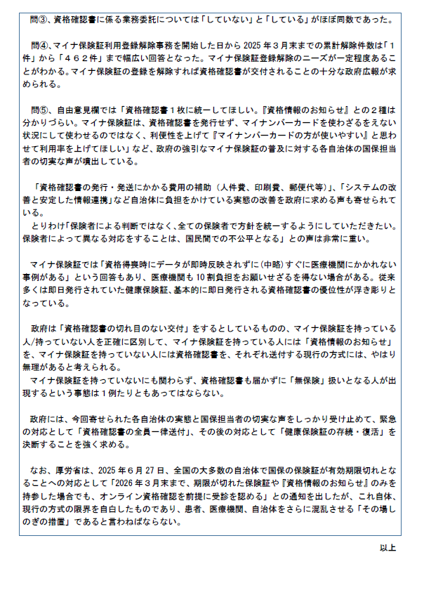 後期高齢者医療制度と同じく、2025年7月末までに資格確認書を全ての被保険者に、申請の有無に関わらず発行する必要があると考えています。