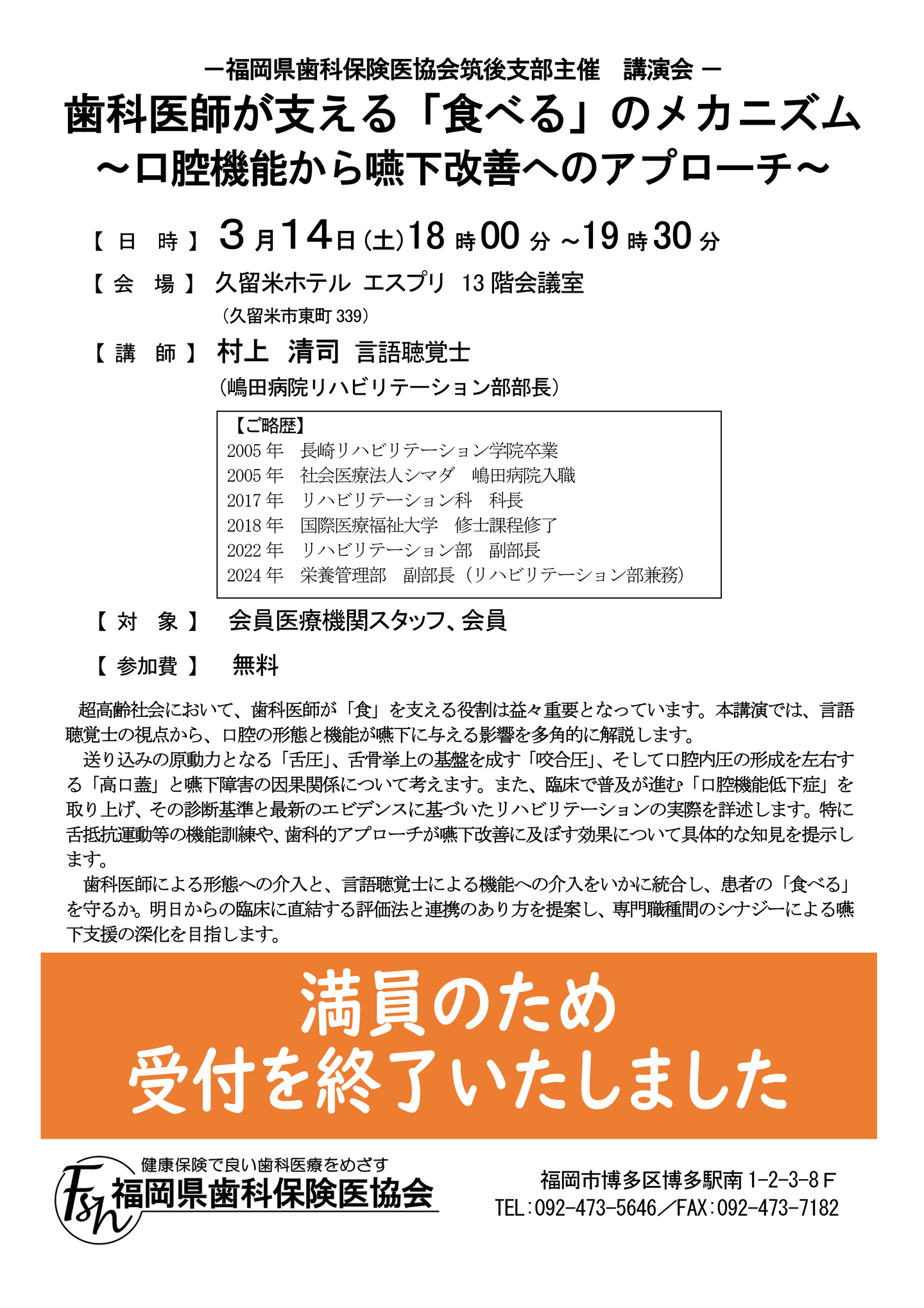 ■参加費無料:会員、会員診療所の歯科衛生士・歯科助手・事務職員