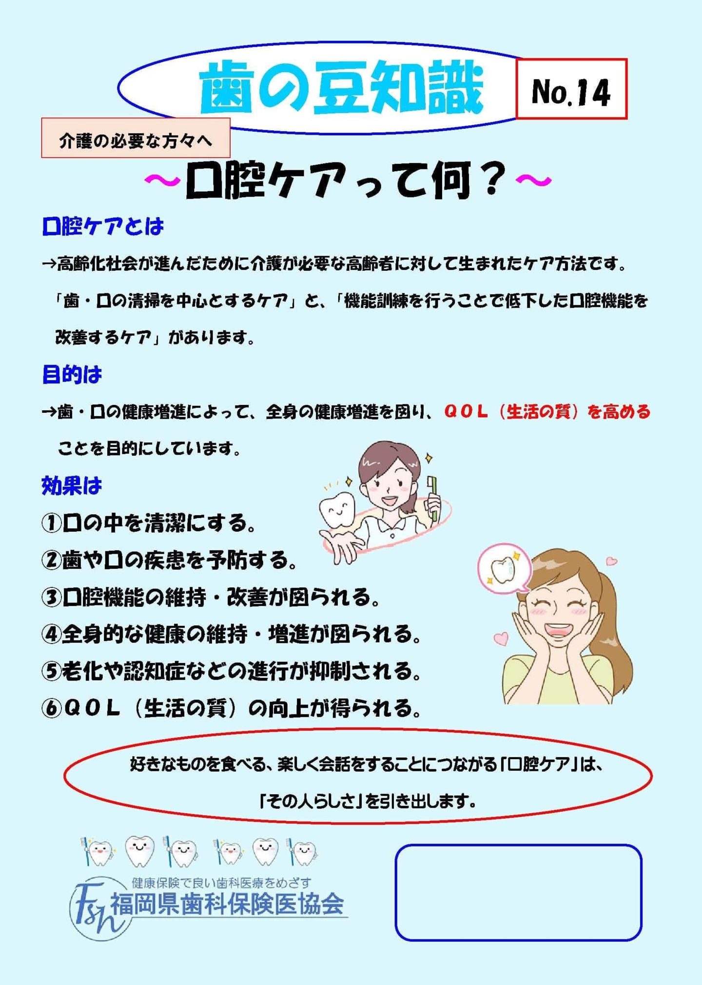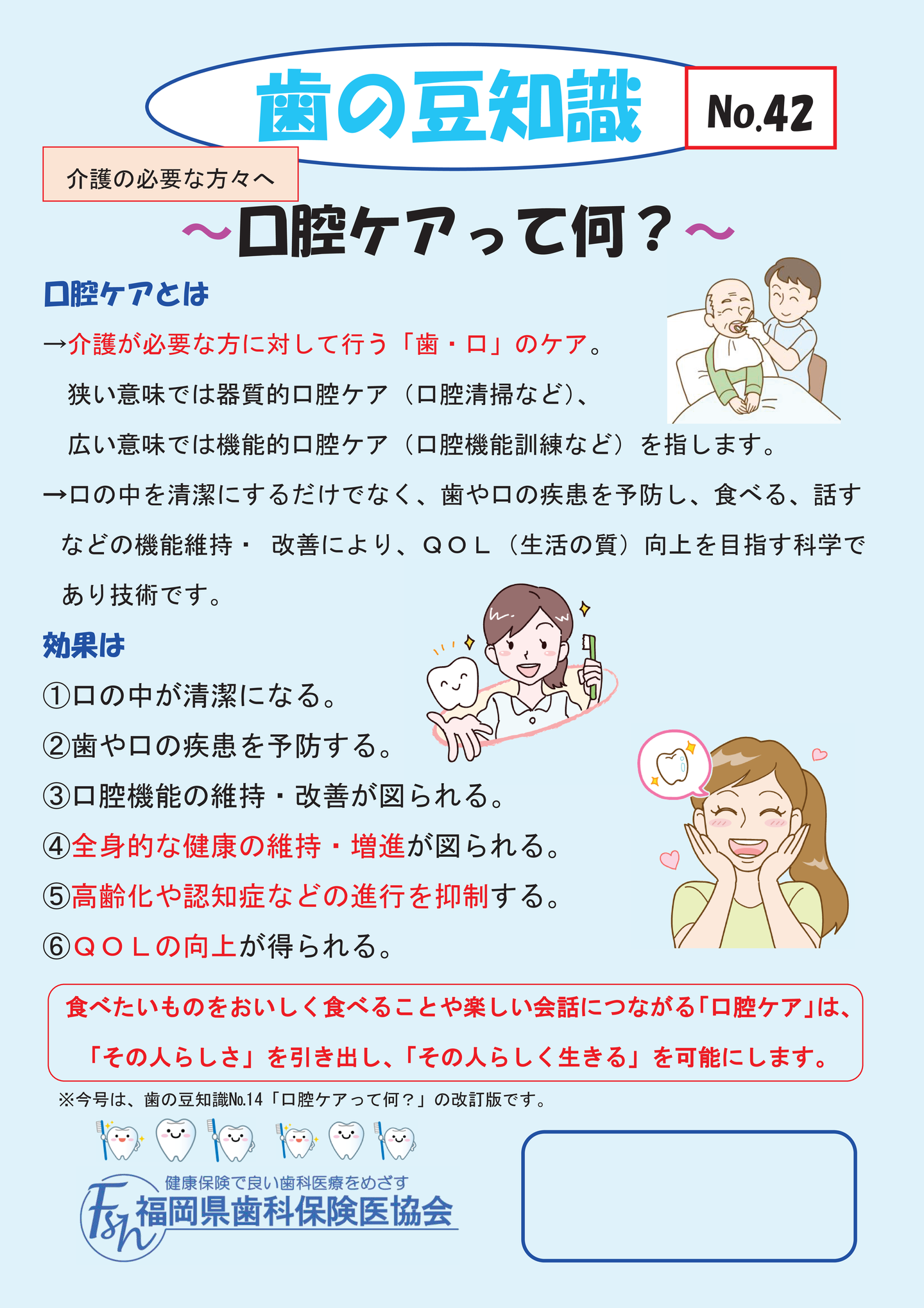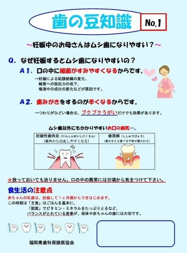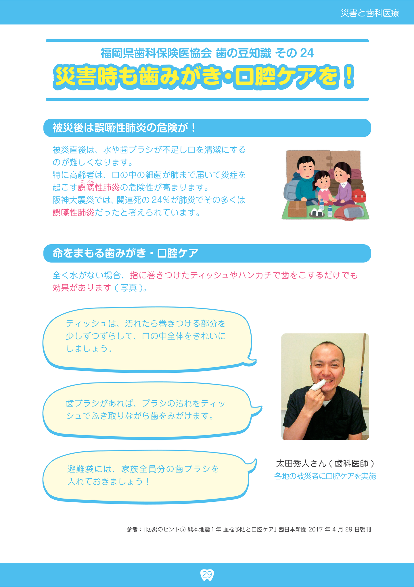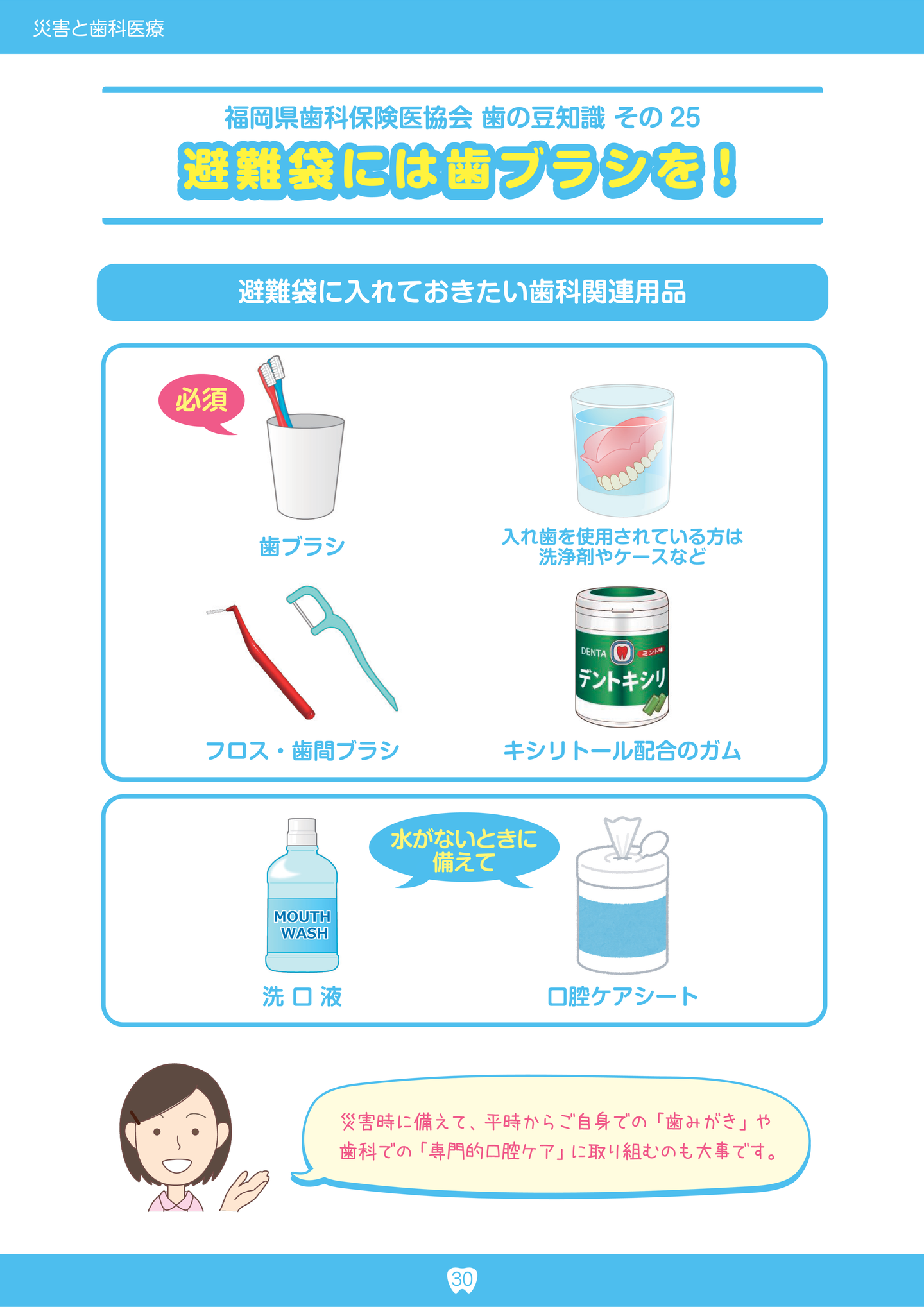現在、当会の冊子『歯の豆知識』の災害関連ページ「災害時も歯みがき・口腔ケアを!」「避難袋には歯ブラシを!」を、被災地での啓発にご活用いただいています。